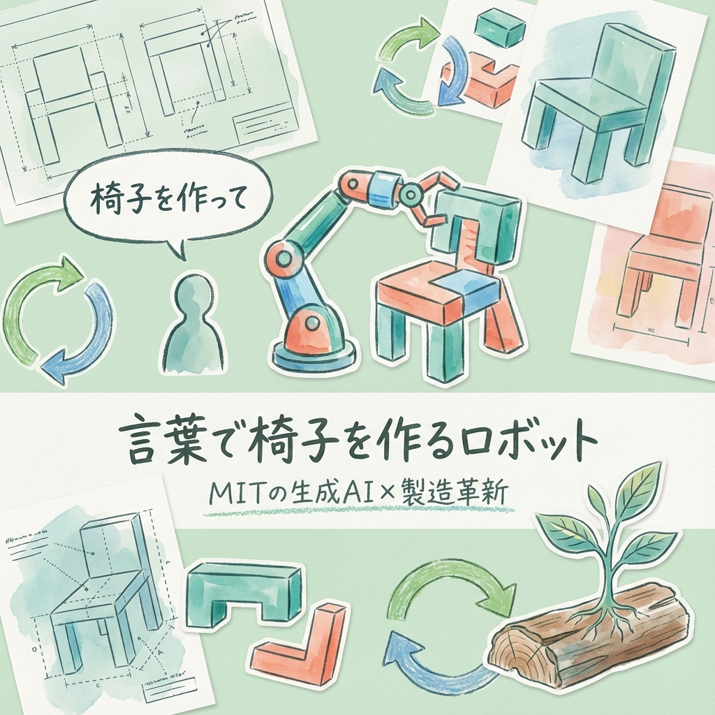 記事2025年12月18日•2 min readMITが言葉で椅子を組み立てるロボットを公開、生成AIと物理製造を融合MITが自然言語指示で椅子を組み立てるAIロボットシステムを発表。生成AIモデルで3D設計、別のAIでパーツ配置を推論、ロボットが自動組み立て。ユーザー評価で90%以上が従来手法より高評価。#ロボティクス#生成AI#製造
